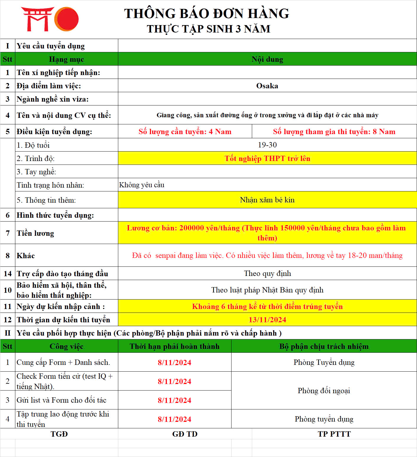 📌 Phúc lợi: “ Công Ty có nhiều việc làm thêm. Thưởng theo năng lực cố gắng làm việc; Tăng lương theo năm và theo cố gắng nâng lực. Tiền Nhà 20.000 yên (Nếu cố gắng làm việc công ty sẽ hỗ trợ tiền nhà). ...