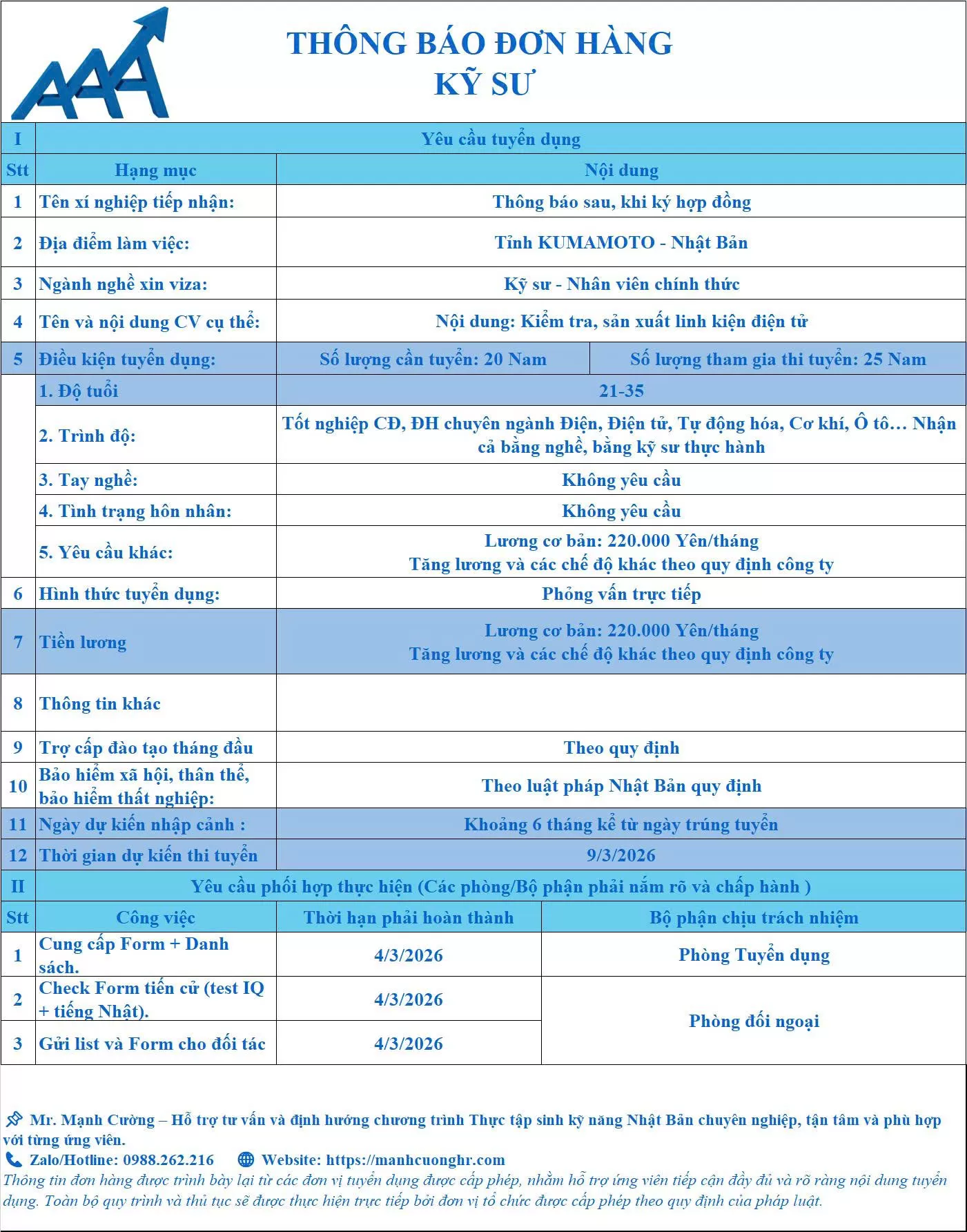 📌 Phỏng vấn trực tiếp 9/3/2026 – xuất cảnh khoảng 6 tháng sau trúng tuyển.