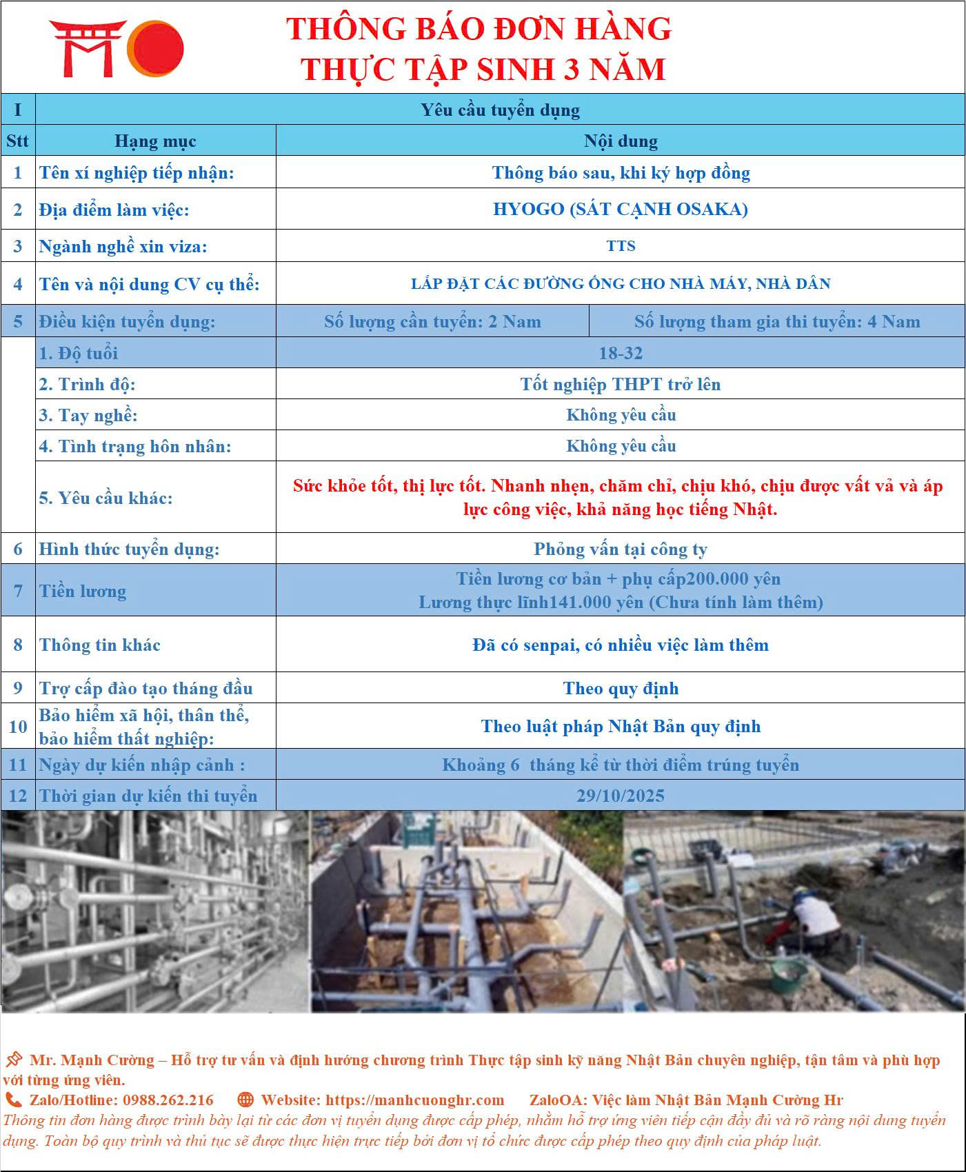 TUYỂN NAM LẮP ĐẶT ĐƯỜNG ỐNG LƯƠNG VỀ TAY 20 MAN